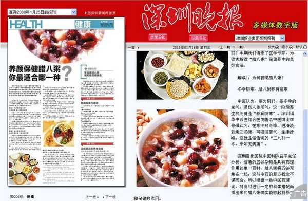 本周六是腊月初八,在这个富有传统气息的“腊八节”,人们捧起一碗热气腾腾的腊八粥,除了对传统习俗的尊重和沿袭,更加表现了现代人对中医保健、美容的信赖和追求。清代营养学家曹燕山撰《粥谱》阐述:“腊八粥是“食疗”佳品,有和胃、补脾、养心、清肺、益肾、利肝、消渴、明目、通便和安神的作用。