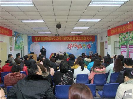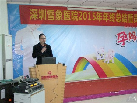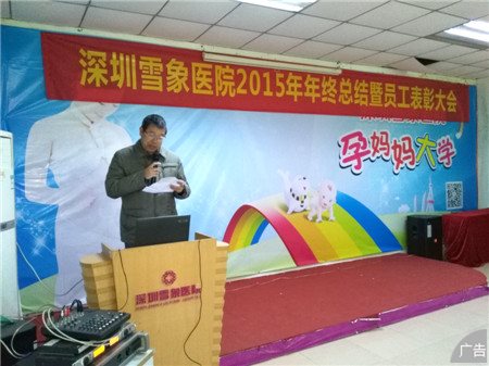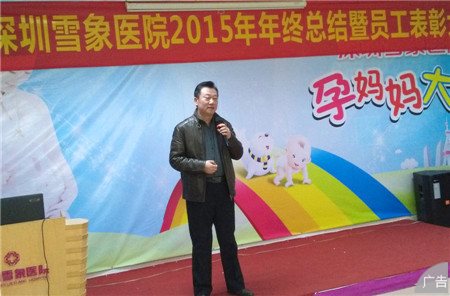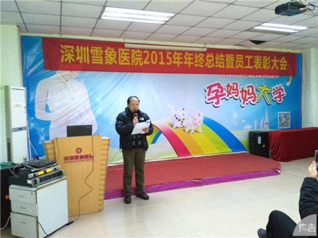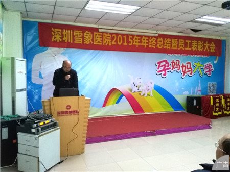 2016年1月25日下午,深圳雪象医院在四楼会议室隆重召开了2015年年终工作总结暨员工表彰大会。希思国丹医疗集团运营总监梁洪先生、集团总部人力资源经理蔡振英女士、深圳雪象医院院长詹俊云先生、副院长袁伟祺先生等领导及全院职工200余人共同参加了此次会议。