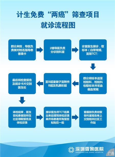 持有效证件到坂田街道计划生育服务中心报名登记后,按服务中心预约的时间来深圳雪象医院免费检查。