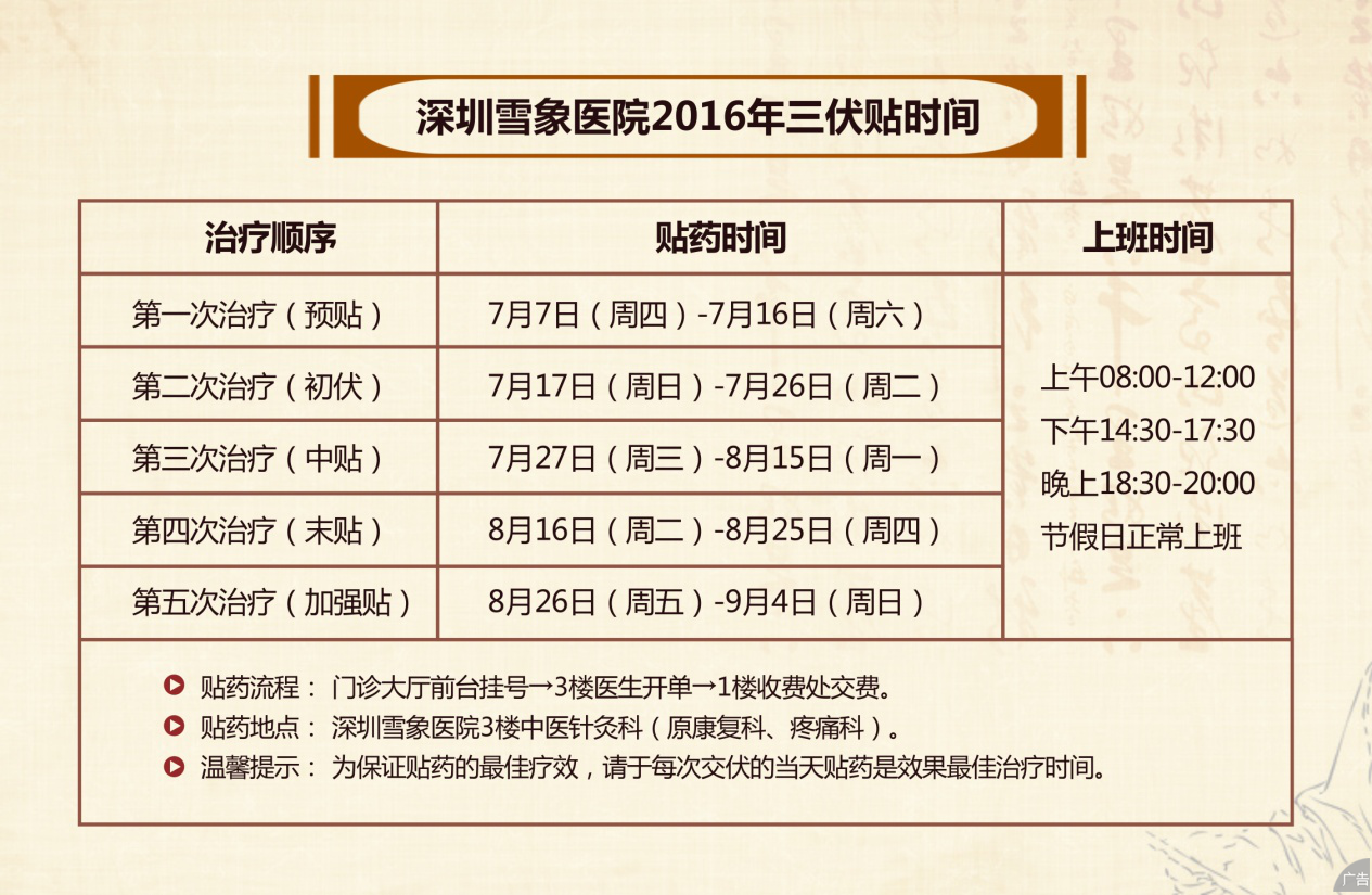 又是一年三伏天,冬病夏治好时节!冬病夏治三伏贴疗法属于中医传统外治法之一,根据“春夏养阳,秋冬养阴”的原则,使人体之阳气得天阳之助和药物阳气的疏通达到温阳利气,驱逐内伏寒邪,增人体阳气和免疫力,达到治病和养生的目的。深圳雪象医院中医针灸康复科三伏贴疗法由名中医医生配方,中医精髓医生出诊,采用地道中药材,中医特色的专科制作,正宗三伏贴疗法更有效!
