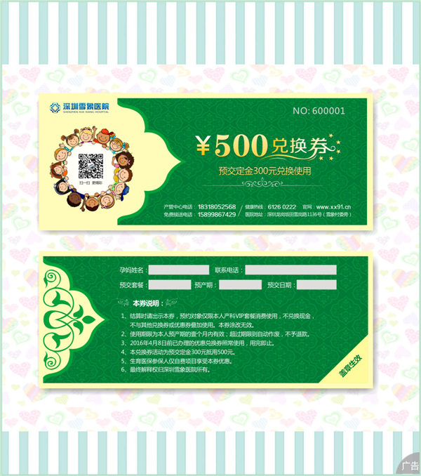为答谢坂田社区居民,如果您选择产科预交定,可以参与兑换券优惠活动,目前有两款优惠劵适用于产科套餐:其中预交定“300元抵用500元”适应于自然分娩、剖宫产中的吉祥套餐;而自然分娩、剖宫产如意和尊贵套餐均可任意选择两款优惠劵中的任意一种(预交定可以现场刷银联卡或选择微信支付)。