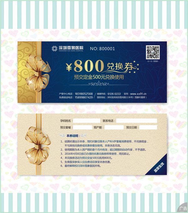 为答谢坂田社区居民,如果您选择产科预交定,可以参与兑换券优惠活动,目前有两款优惠劵适用于产科套餐:其中预交定“300元抵用500元”适应于自然分娩、剖宫产中的吉祥套餐;而自然分娩、剖宫产如意和尊贵套餐均可任意选择两款优惠劵中的任意一种(预交定可以现场刷银联卡或选择微信支付)。