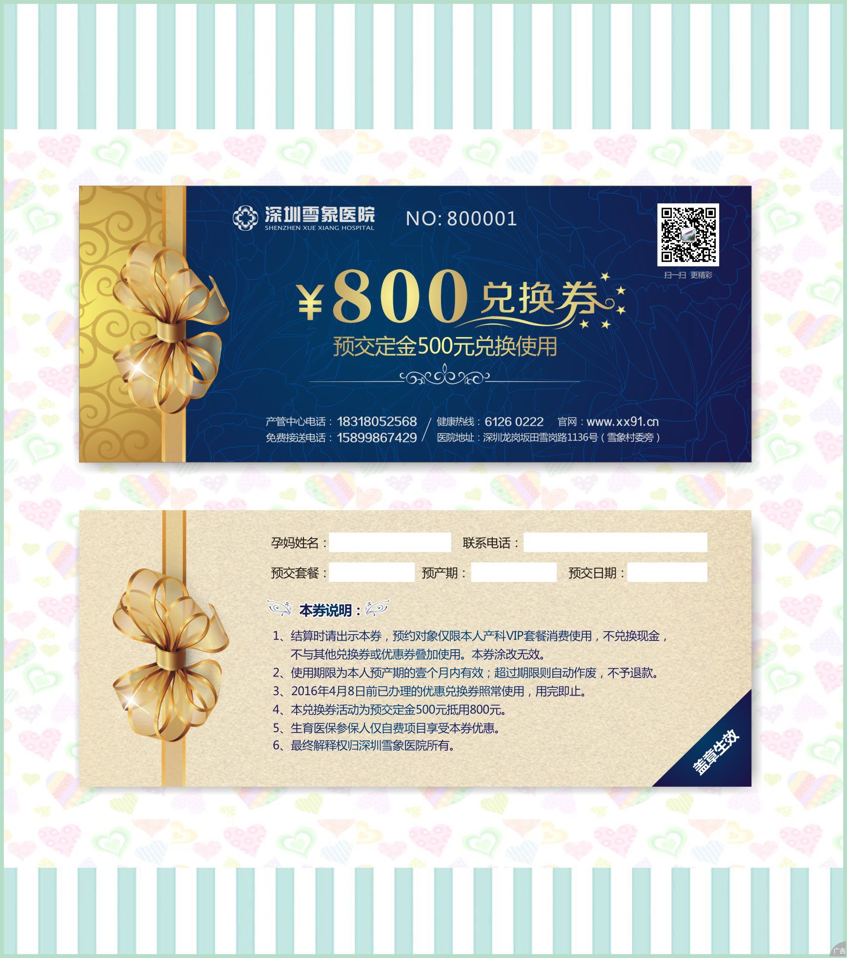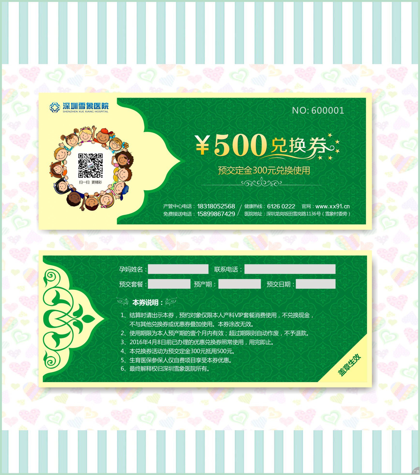 为答谢坂田社区居民,如果您选择产科预交定,可以参与兑换券优惠活动,目前有两款优惠劵适用于产科套餐:其中预交定“300元抵用500元”适应于自然分娩、剖宫产中的吉祥套餐;而自然分娩、剖宫产如意和尊贵套餐均可任意选择两款优惠劵中的任意一种(预交定可以现场刷银联卡或选择微信支付)。