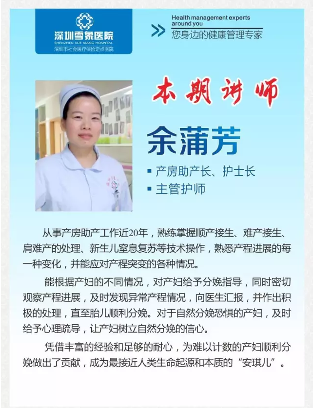 本周周日上午10点,产房护士长、助产长余蒲芳将为各位准妈妈、准爸爸传授秘籍,分享科学分娩和分娩技巧。