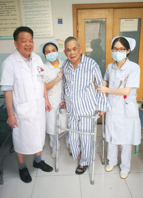 术后第二天陈荣生主任和护士们帮助老人手扶助行器开始离床活动