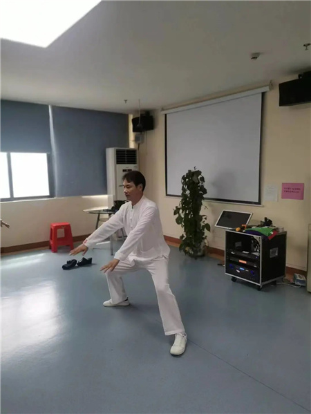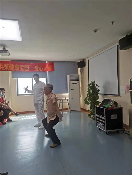 现场由李老师和社区老人唐叔一起为大家示范,唐叔说:”我今年78岁,我已经练了10年八段锦,现在身体很棒。”