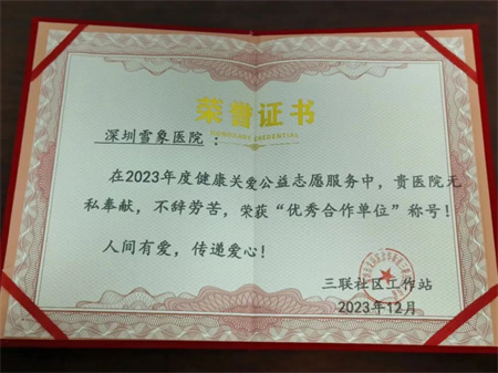 深圳雪象医院在二零二三年度携手三联社区开展中医经络调理、预防心脑血管疾病健康讲座、急诊急救培训及爱心义诊等多次公益活动,人间有爱、传递爱心,守护健康家园。深圳雪象医院作为一路以来关心和支持公益志愿服务的单位,获颁了三联社区”优秀合作单位“的荣誉证书。