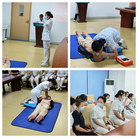 由全院各科室组成的十支队伍通过精彩纷呈的比赛,比赛采用现场演示“单人徒手心肺复苏技能操作”的方式进行。参赛选手需熟练掌握单人徒手心肺复苏标准流程,包括呼救、判断颈动脉搏动、心脏按压、AED的正确使用方法等步骤。